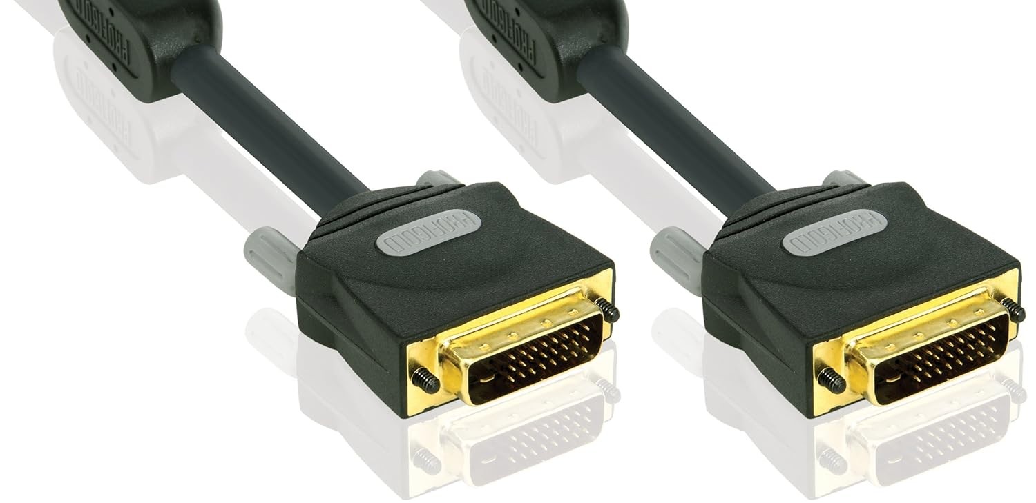 Najwyższej jakości przewód video DVI-D Single Link o długości 2 metrów, profesjonalnie ekranowany, owalny, z filtrami ferrytowymi, pozłacanymi stykami, lutowanymi srebrem złączami, śrubami mocującymi, w kolorze grafitowym.